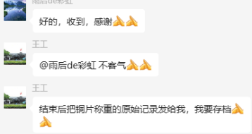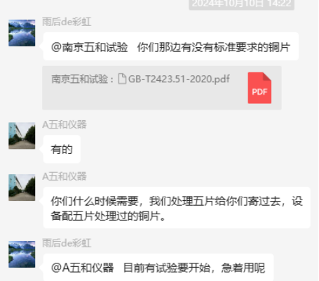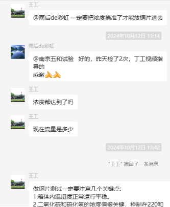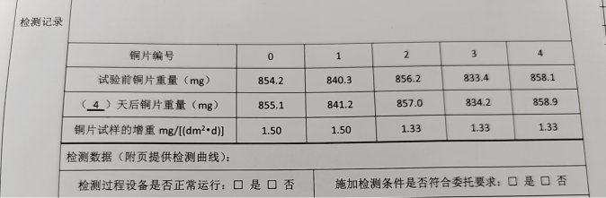 為了更好地說(shuō)明銅片試驗的重要性,下面分享一個(gè)檢測公司的銅片試驗實(shí)際案例:2024年8月份合肥******檢測技術(shù)有限公司第一次采購我司一臺型號為“WHQ-300B”型的混合氣體腐蝕試驗箱,設備被運送到客戶(hù)指定的場(chǎng)地安裝調試運行。安裝調試后,客戶(hù)后期自行進(jìn)行一次銅片增重試驗,我司技術(shù)人員進(jìn)行線(xiàn)上指導操作,試驗結束之后客戶(hù)將數據發(fā)給我司,以下是客戶(hù)和我司聊天記錄以及客戶(hù)做的數據信息: